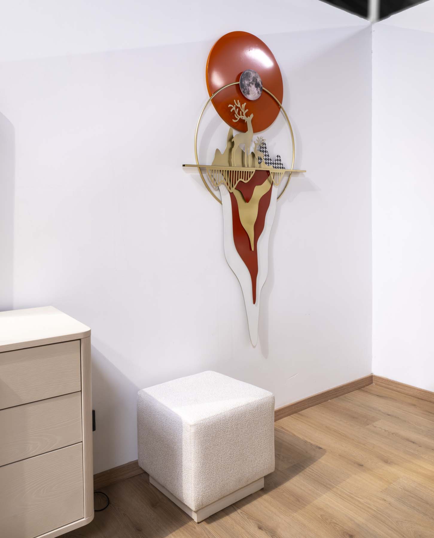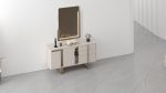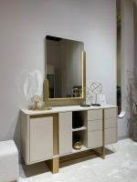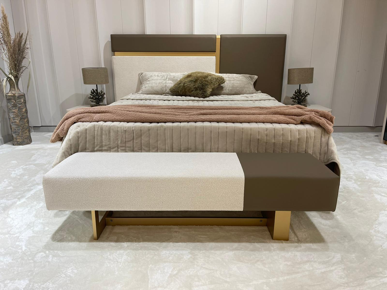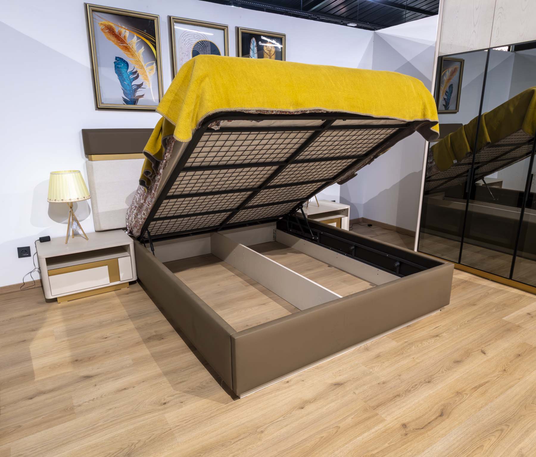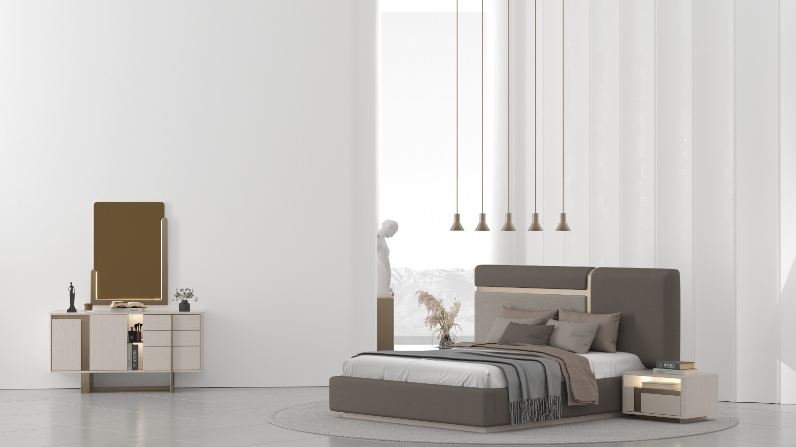 Le lit 1,60 x 2 m avec rangement intégré et revêtement en tissu brocart haut de gamme assure confort et élégance. L’ensemble est complété par une commode et deux tables de nuit équipées de LED, créant une ambiance harmonieuse adaptée aux intérieurs modernes et aux espaces de repos soignés.