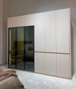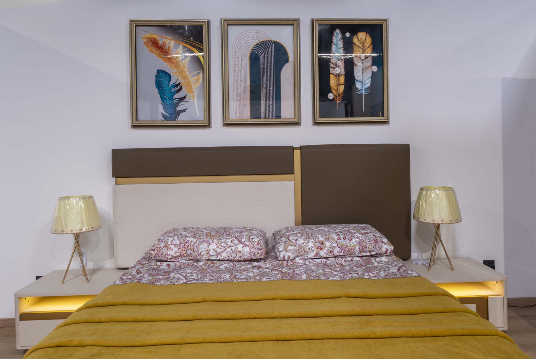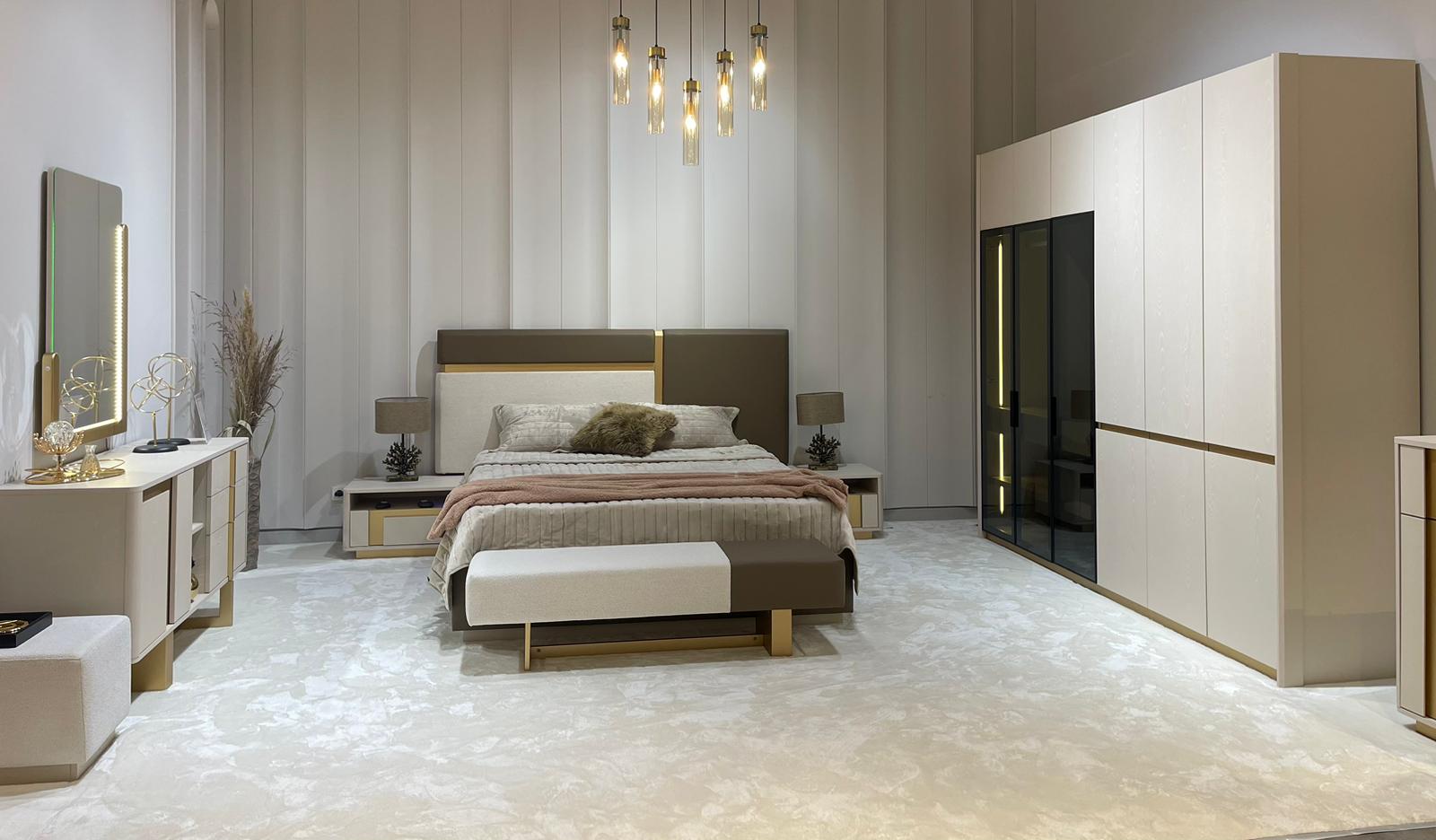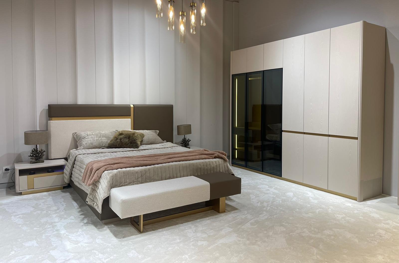 Chambre moderne en MDF avec armoire LED, lit brocart et mobilier élégant au design raffiné.