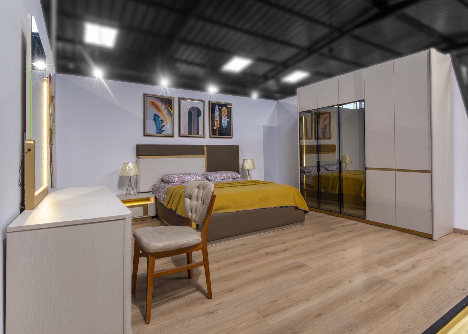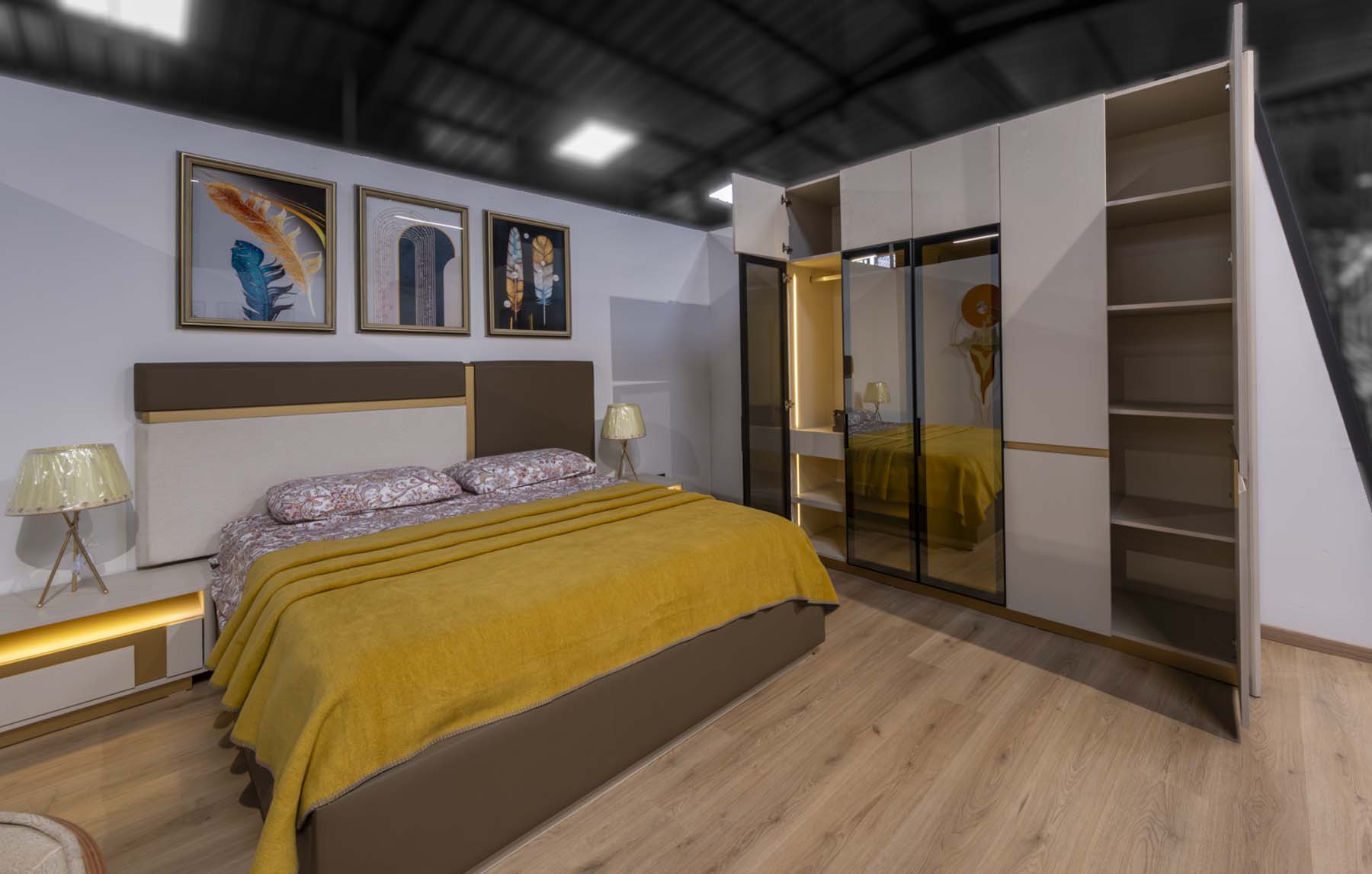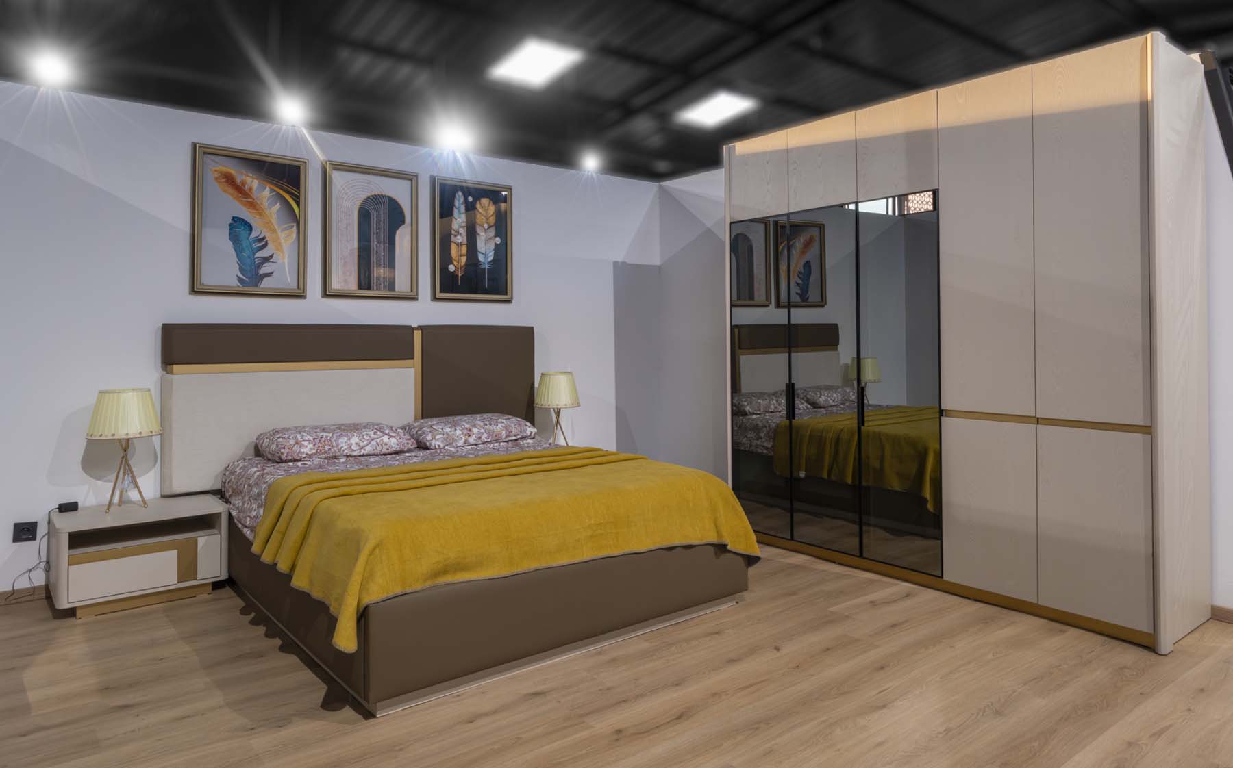 Chambre élégante en MDF avec armoire spacieuse, lit confortable et éclairage LED intégré au mobilier.