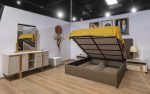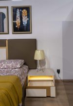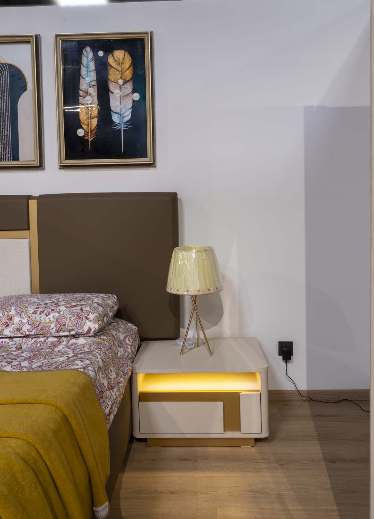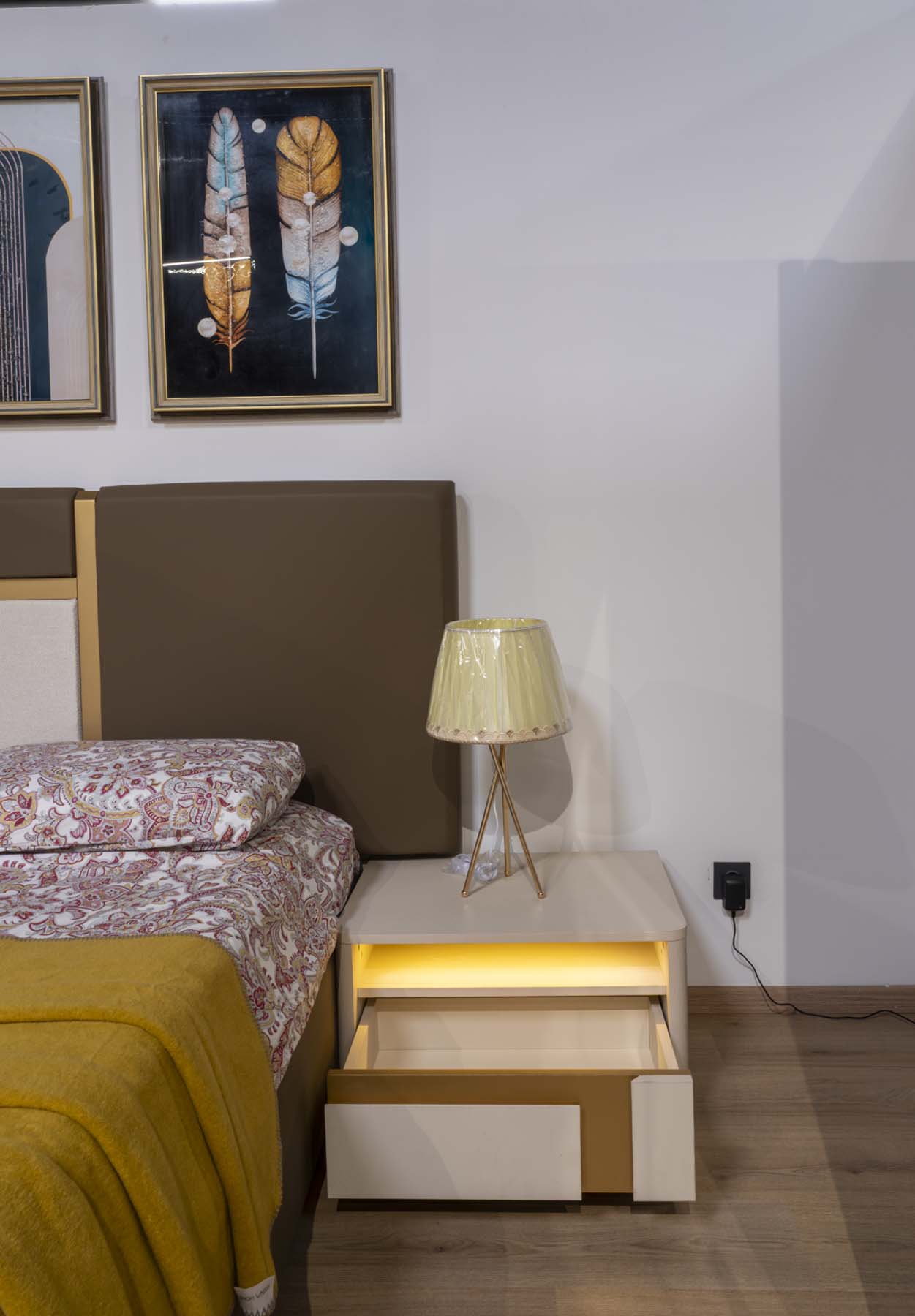 Chambre moderne et lumineuse avec lit LED brocart et coin thé intégré pour un espace complet et chic.