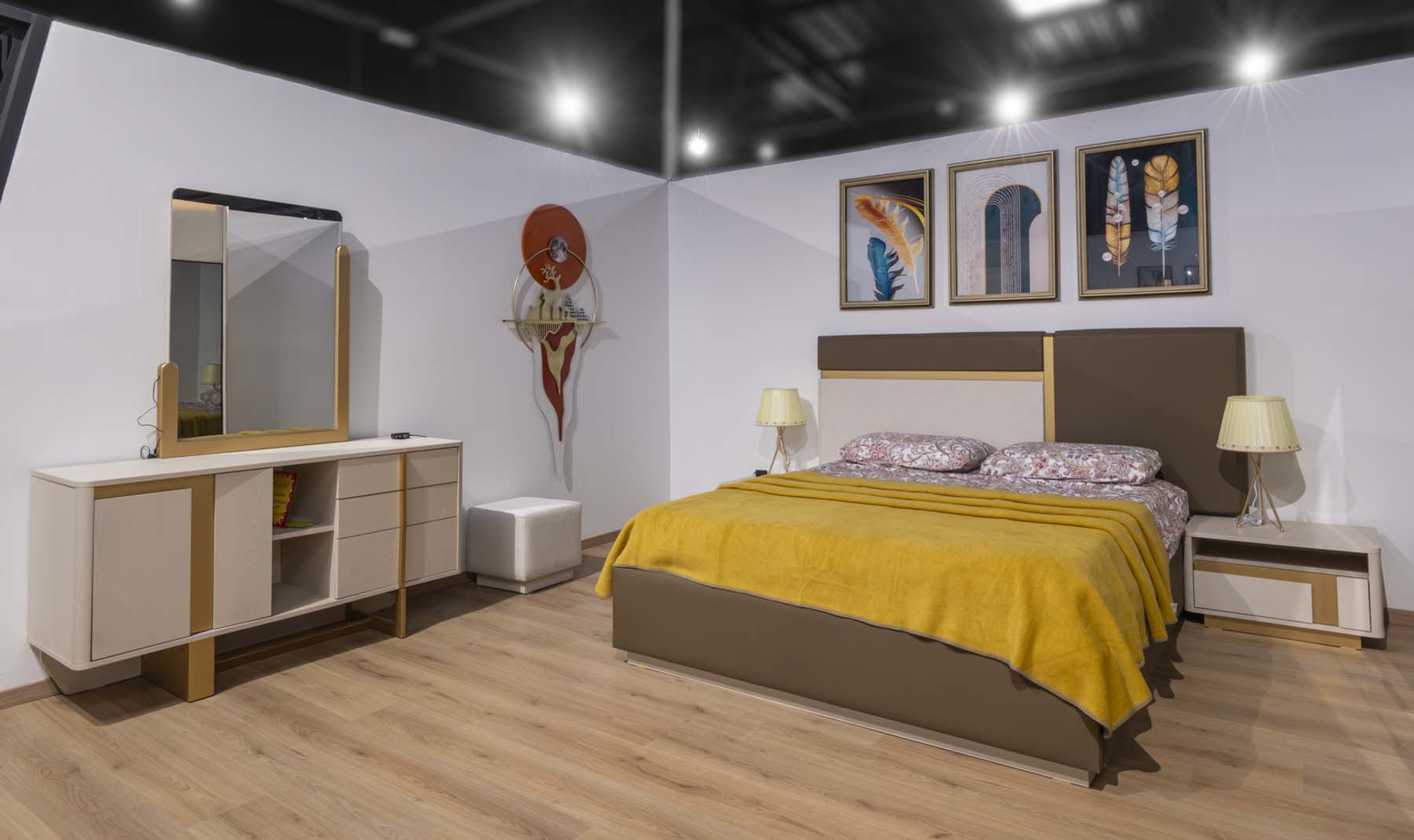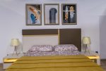 Chambre raffinée en MDF avec lit brocart et armoire moderne, alliant confort et style élégant.