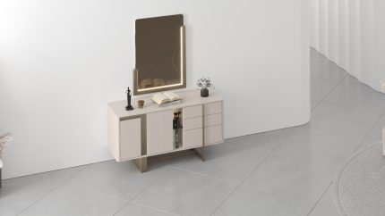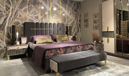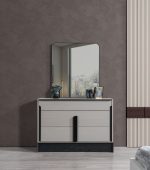 L’ensemble inclut également une commode ainsi que deux tables de nuit, formant un mobilier cohérent et fonctionnel. Cette chambre s’inscrit dans un style moderne, pensé pour offrir confort, praticité et harmonie visuelle dans un espace de repos bien aménagé.