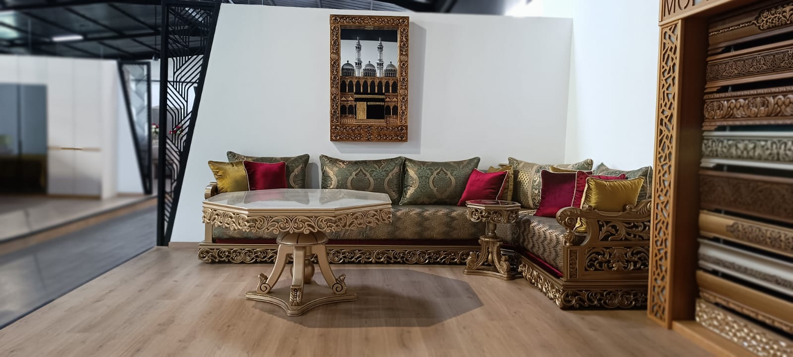 Cet ensemble comprend deux salons marocains, l’un en style 3D et l’autre en finition Mankouche, offrant deux expressions complémentaires du mobilier traditionnel. Ils sont accompagnés d’une table centrale ainsi que de cendriers, formant un espace complet dédié à la réception et à la convivialité.